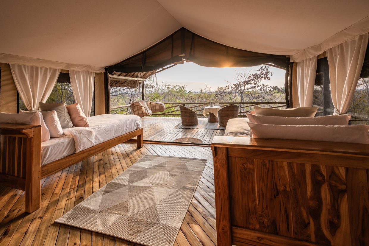 The twelve tents are spaced around the lower perimeter of the hill with views across the plains. They are pitched on high wooden platforms with traditionally built thatched roofs that provide shade from the classic African sun while you sit on your verandah and look out for game around the camp.
